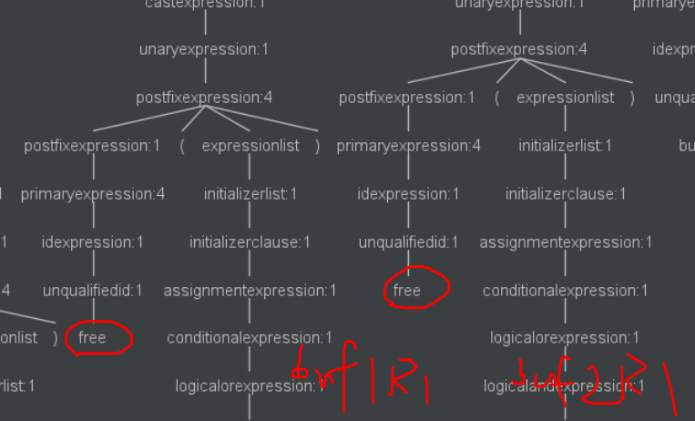 free语句都在语法分析树的右侧![]()