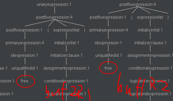 从语法分析树中看不出任何问题,因为这个存在漏洞的代码是语法正确的,而且也符合 C 语言语法结构。所以我们在编写相关代码时,要自行检查指针的使用情况,最好在释放指针所指向的空间后,将其置为NULL。