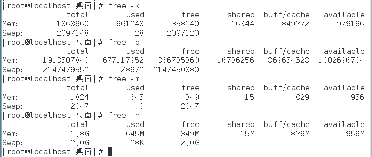 free 命令用于查看系统中已用空间和可用空间。表头从左到右的含义为总空间,已用空间,空余空间,共享空间,缓存空间,可用空间。第一行为存储区,第二行为交换区。