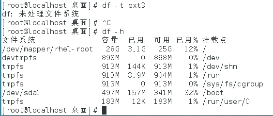 -t代表限制列出文件系统的类型,由于当前系统没有ext3格式的类型,所以会显示 “未处理文件系统”。