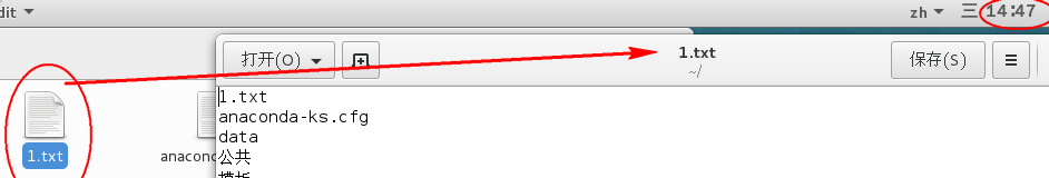 比如,上图描述了在 14:45 分时,列出用户家目录的文件列表,并把它放入1.txt文件中。执行效果如下