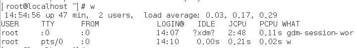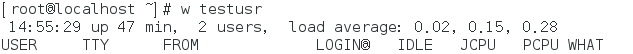 w命令显示目前登入系统的用户信息。执行这项指令可得知目前登入系统的用户有哪些人,以及他们正在执行的程序。(testusr没登录,所以这里没有他的信息)