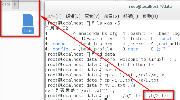 ..和.是特殊的隐藏文件,分别代表上级目录和本级目录。-s代表显示各个文件的大小,后面的-S代表以文件大小对输出结果排序。- Linux 系统下,认为每一个目录 “大小” 为 4kb。