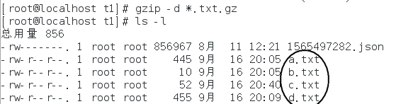 -d选项可以解压gz格式的压缩文件。在这里可以验证原来文本文件的大小。