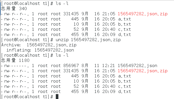 -d选项可以指定解压至哪一个文件夹。而unzip的默认处理方式为-j,即直接解压至压缩包同级目录下。注意到inflating的输出有所不同。