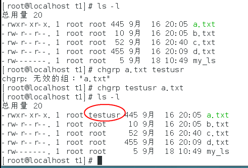 执行后发现ls -l的第四列结果(文件所属用户组)发生变化。