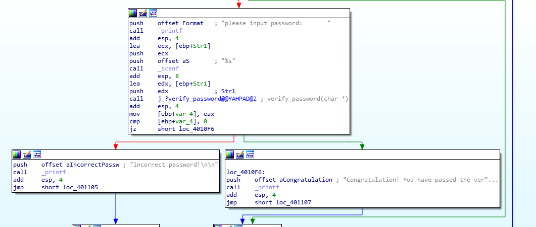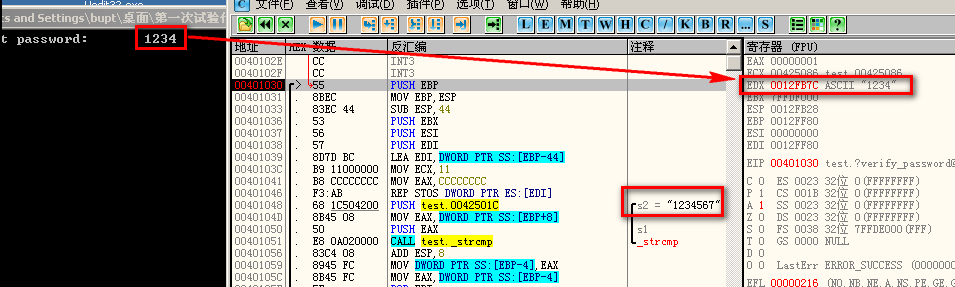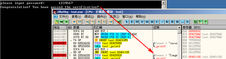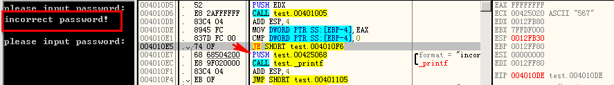 s1与内部存储的s2("1234567")进行了strcmp比较,strcmp是一个 C 语言的比较函数,若两个字符串str1和str2相等,则返回0,这里不相等,且str1<str2,所以strcmp返回值为-1,authenticated的值也为-1,非零,验证失败。这里也可以看到,在4010E5处有一个关键的JE跳转,表示表达式为零即跳转,跳转不成功,就会执行打印"incorrect password!"。若输入了正确密码,则跳转成功,转而执行输出"Congratulations"分支。 -