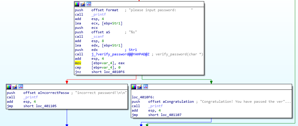由于scanf没有检验结束节点,当数组被溢出到一定程度时,就会覆盖整型变量i,输出非预期值。我们可以借鉴这个思路,让输入的password强行将valid_flag置为0,最好可以跳过检验密码函数,直接进入输出验证成功的函数中,以完成破解。