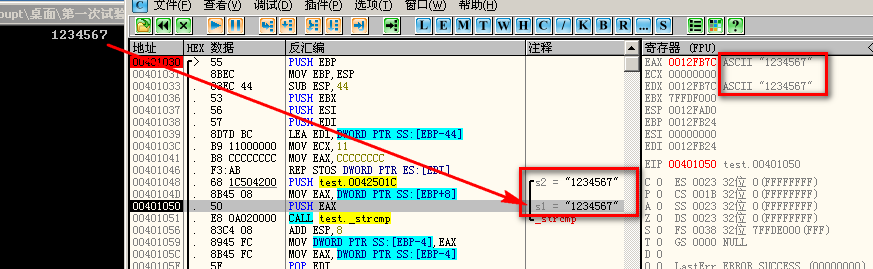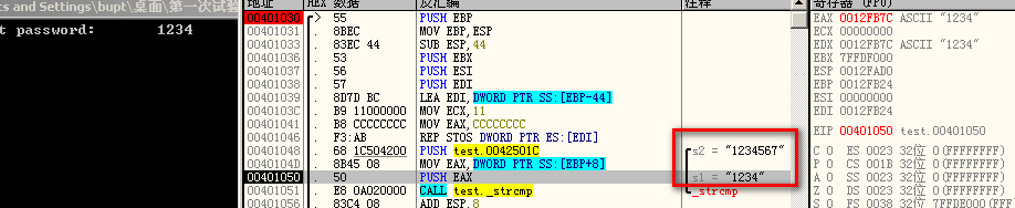 s1与内部存储的s2("1234567")进行了strcmp比较,strcmp是一个 C 语言的比较函数,若两个字符串str1和str2相等,则返回0,这里不相等,且str1<str2,所以strcmp返回值为-1,authenticated的值也为-1,非零,验证失败。这里也可以看到,在4010E5处有一个关键的JE跳转,表示表达式为零即跳转,跳转不成功,就会执行打印"incorrect password!"。若输入了正确密码,则跳转成功,转而执行输出"Congratulations"分支。 -