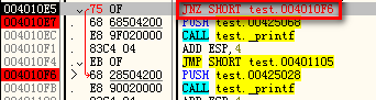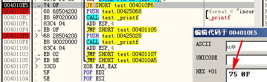 004010E5的JE改为JNZ,具体方法是把opcode从74改成75。这样修改的道理是取反逻辑,把原来的 “输入正确即通过验证” 改为 “输入不正确即可通过验证”,由于未知密码的概率相当大,这样修改相当于跳过了原有的验证过程(当然,假如经过修改后,作了一个 “错误输入” 程序反而崩溃退出了…… 就证明内部定义的密码被你蒙中了)。除此以外,这样的方法是不会对程序运行流程图有大的改变的。