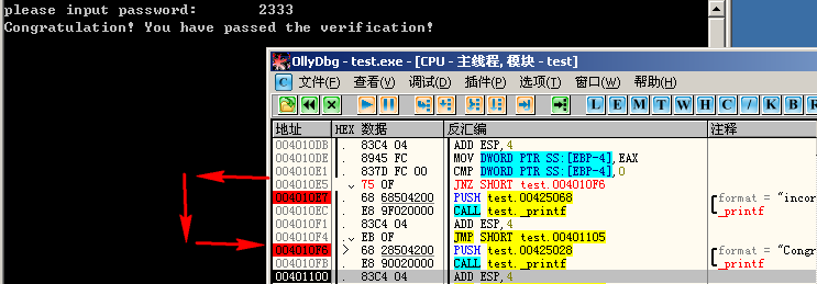 具体方法:将0x004010e5的jz改为jmp无条件跳转,然后抹掉 (nop)0x004010f4 的jmp语句,让验证成功语句得以输出。