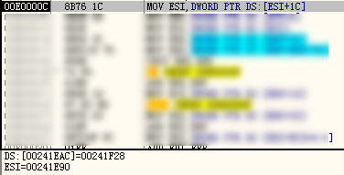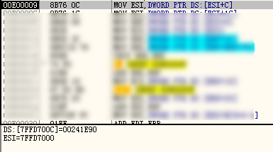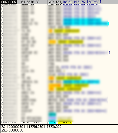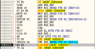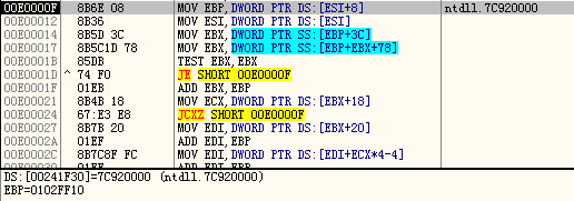 接着,程序向 ESI 寄存器写入了寄存器 DS 的值的偏移,此过程迭代了 2 次,EBX 寄存器也被写了 EBP 的值的偏移,也迭代了 2 次。中间还注意到了 ntdll 的接口。