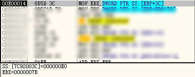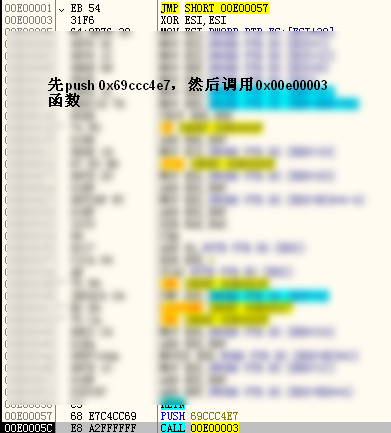 0xe00057的 push 语句,紧接着,它调用了函数0xe00003,跟入函数进去看看。![]()