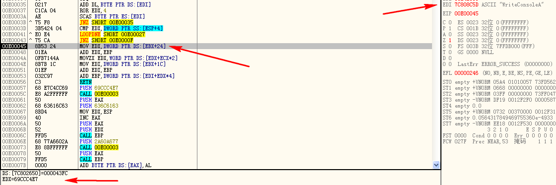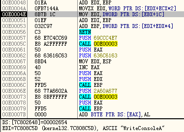 0xe0004e处,此时注意到 EDI 被写入了kernel32.7c808c5d的内容,有一个类似于WriteConsoleA的东西,猜想刚才的过程可能是为了寻找系统 api 的地址,然后把地址作为参数开启后续调用。这个函数执行完后就 return 回去了。