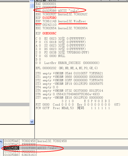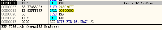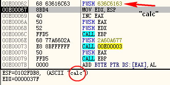 0xe00062处,push 了一个 "calc" 字符串,然后将其移动到 EDX 寄存器上。