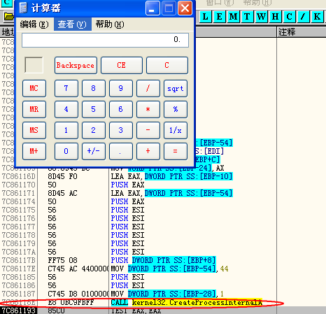 kernel32.WinExec的地址,结合前面推入的calc参数,推测此时准备开始执行了计算器。跟入WinExec,可以看到CreateProcessInternalA函数,创建了一个新进程。