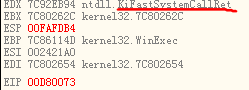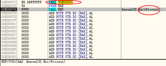 PUSH-CALL 函数-PUSH EAX-CALL EBP操作。可以看到,这次操作最终使得kernel32.ExitProcess被调用。推测是为了杀掉 SCer 进程。![]()