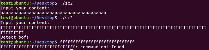 - 当 content 输入字数增加时,会看到 "Detect bof!" 的提示,能明显看到,后面又多出了几个 "f" 的输入,这大概就是输入溢出的体现了。(因为后面溢出的字符被当成命令执行了)