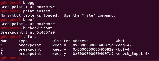 b命令时可以看到断点的地址。大概判断egg函数的地址在0x40079c处,bof在0x40082e处,check_input在0x4007a9处。![]()