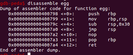disassemble命令看一下egg函数的汇编,左侧显示egg函数的头部在0x400798处,恰好对应于上图的0x40079c-4处。![]()
