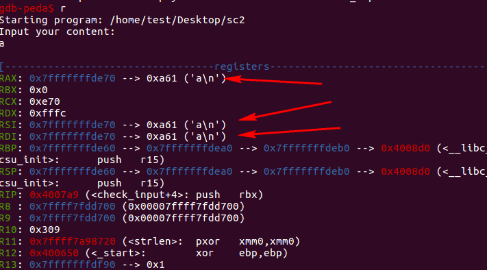 这是输入一个字母 "a" 后,栈的相关情况。我们可以看到,RAX、RSI、RDI 寄存器中都推入了一个 "a" 的值 (