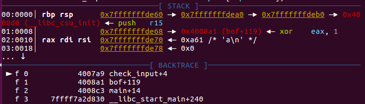 0x7fffffffde70处相应地有一个0x61的值,在栈相对位移的0x10处。 结合上图的 RIP 指针和下图的backtrace来看,下一步断点位将是在check_input偏移值 + 4 处。地址为0x4007a9处。