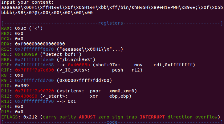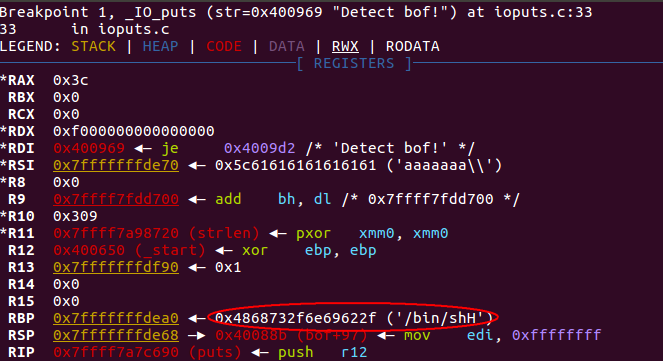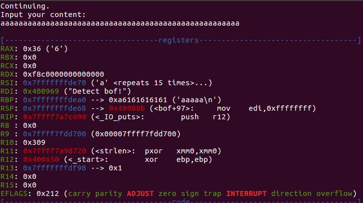 此时 RDI 指向 "Detect bof!",RIP 指向