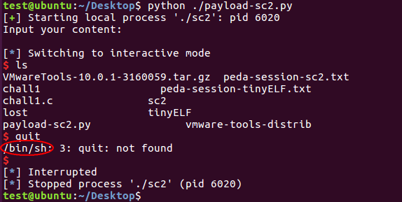$号出现在 shell 的左侧,这是一个小 shell (bin/sh),可以执行一些简单的命令,在 CTF 的 pwn 题中经常用于反弹 shell,获取 flag 文件。 -