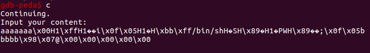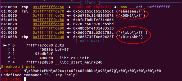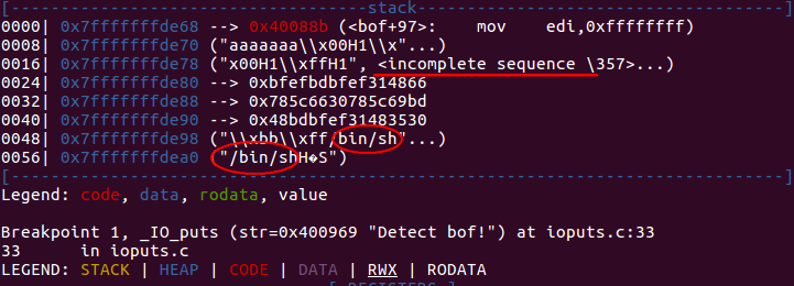 0x7fffffffde70)中,在 RBP 中看到了 "/bin/sh" 的字样,这是 Linux 下的一种 shell。然后在栈中看到了被 “截断” 的序列\x00H1\xffH1。中间隔离了一些内容后,下方被注入了bin/sh字符串。随后在puts调用时,bin/sh被推到 RBP 上,在函数退出后,bin/sh将会执行,中间的一些地址应当是bin/sh的地址。![]()