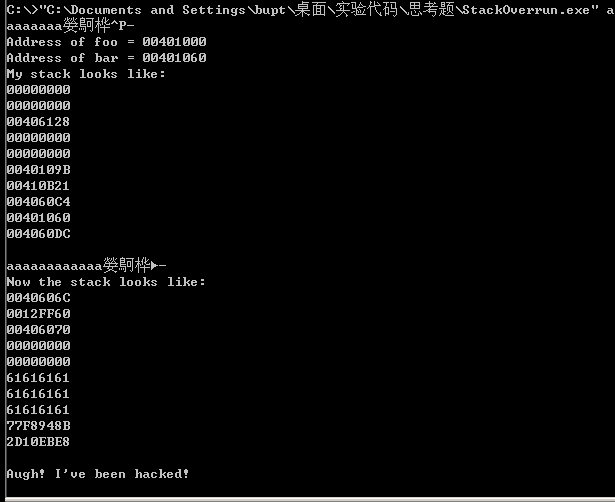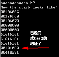 0x401060,bar函数的地址,目标达到了。紧接着程序就因为栈不平衡而崩溃了。![]()