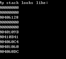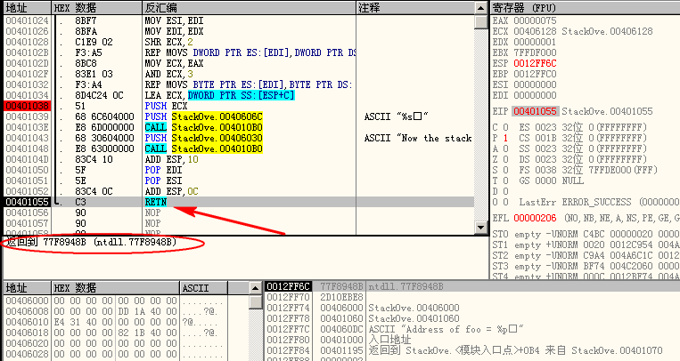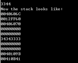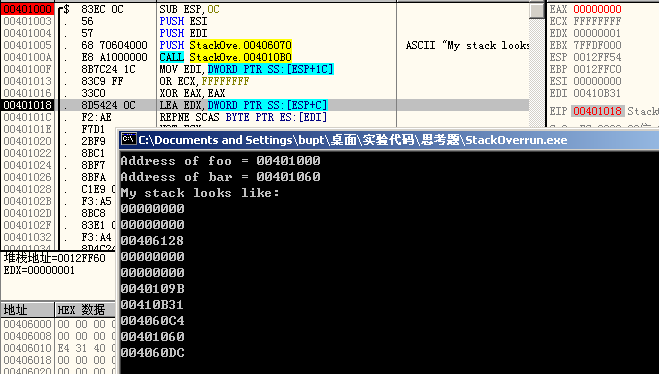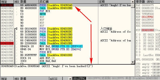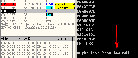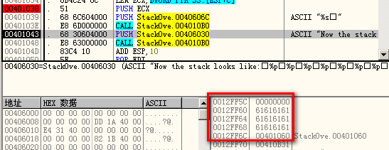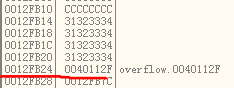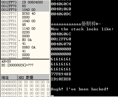 0x12ff6c中存储的返回地址值变成了0x401060。前面的0x12ff60~0x12ff68也已悉数占满。