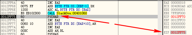 12ff70地址后,其中所写入的数据都被当作指令来执行,我们的 shellcode 被成功解析为了call指令。![]()
