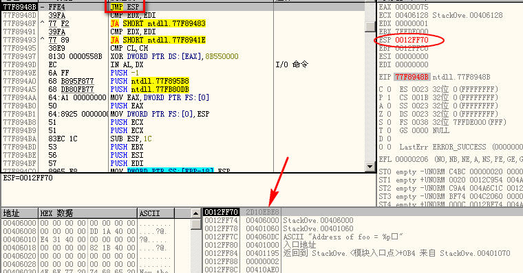 jmp esp构造相关知识,构造 payload 为 12 个填充字符 "a"+jmp esp地址0x77f8948b(大端书写)+shellcode(call bar()的机器码)。下面简单看一下运行该参数之后,栈的情况。