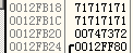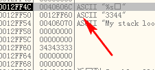 0x12fb18处的数据如下,显示为00 34 34 34,恰好是"4"的 ascii 码十六进制表示![]()