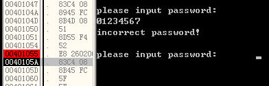 - 进入 ollydbg,在函数调用处打断点。开始运行程序,输入一个较短的密码,就以