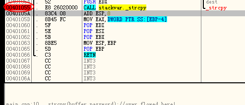 strcpy的调用点在0x401055处。![]()