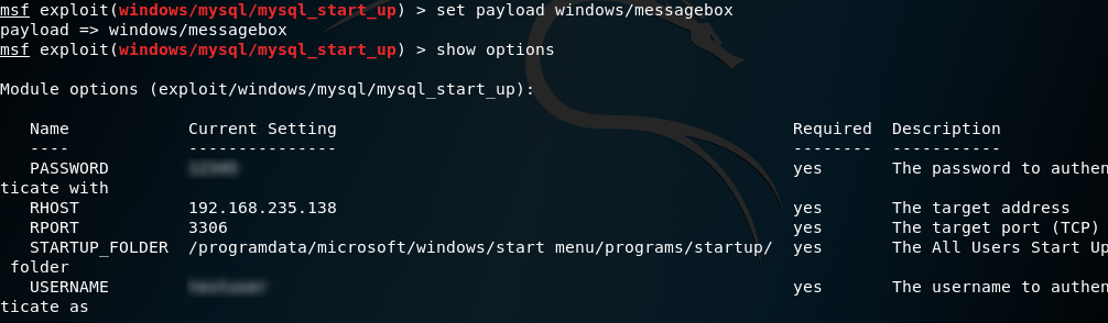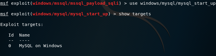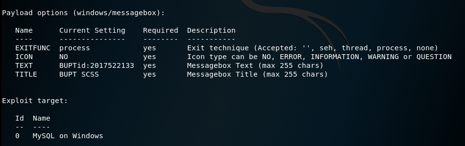 use <漏洞全名>,进入漏洞利用模式。show targets的结果代表了 Windows 上的 MySQL 可能会被利用。![]()