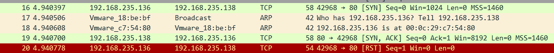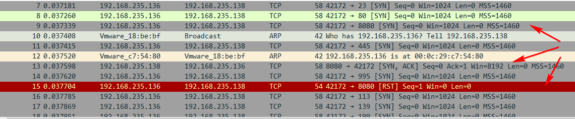 对扫描过程抓包,发现前半部分与扫描端口、服务时基本一致,假如端口开放,目标机会发回 SYN + ACK 包,此时自己再发出 RST 包