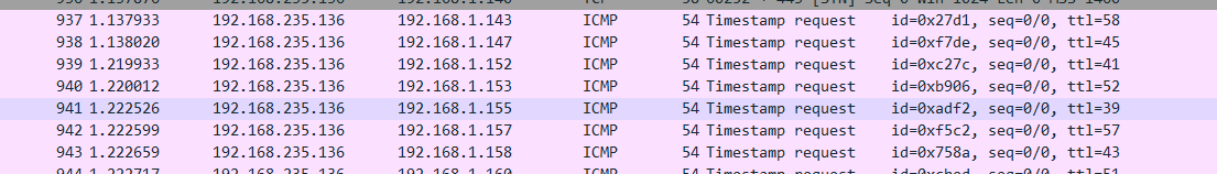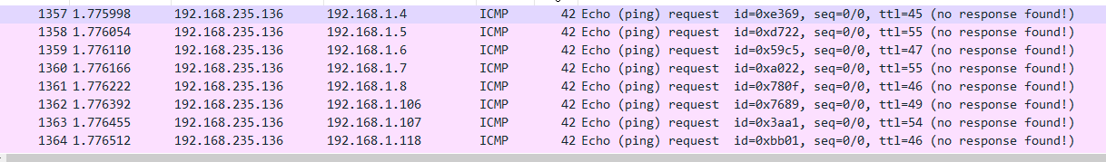 我用 ping scan 扫描了192.168.1.0/24整个网段,可以看到密集的 ICMP 请求,是在做 ping 操作。