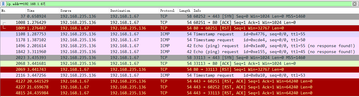 PSH|FIN标记的请求时,目标机回复的应答包中,确认序列号为攻击者序列数 + 1,可以从这里提取出目标机操作系统为 Windows,这是 ACK 扫描 —— 一种检测目标主机操作系统的方法。![]()