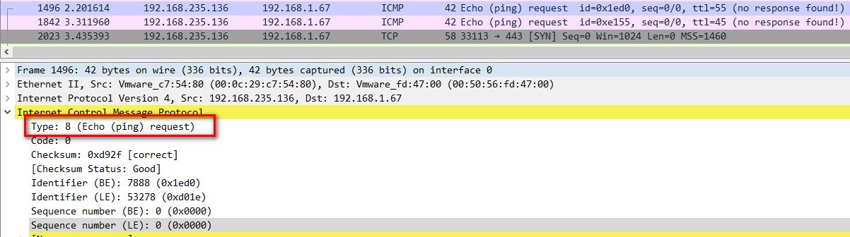 - 扫描机向目标主机发送了 ICMP Echo Request (type 8) 数据包,等待回复的 ICMP Echo Reply 包 (type 0),这是 ICMP Echo 的扫描技术。