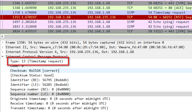 短时间内同时向多个 IP 地址发送了 type13 的 ICMP timestamp request 请求,这是一种 Non-Echo 的 ICMP 扫描。