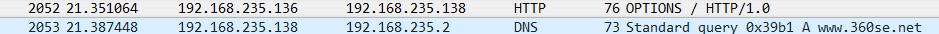 通过 OPTIONS 请求,探求目标机的支持服务类型,紧接着目标机向其 DNS 服务器发动了一次向 www.360se.net 的解析请求。