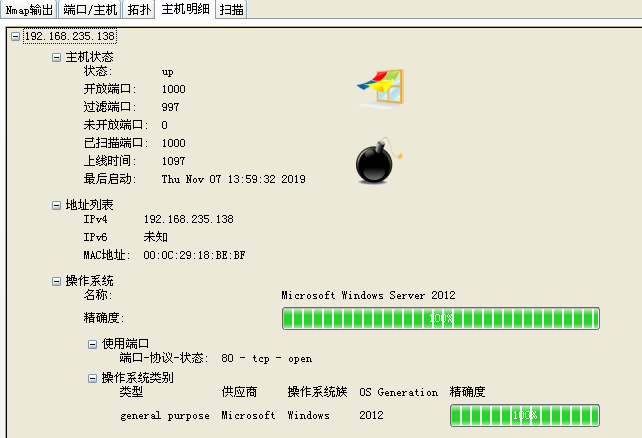 - 首先上扫描结果。可以看到扫描结果基本正确,操作系统也比较准确。