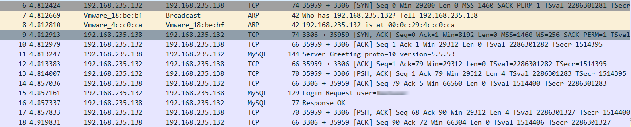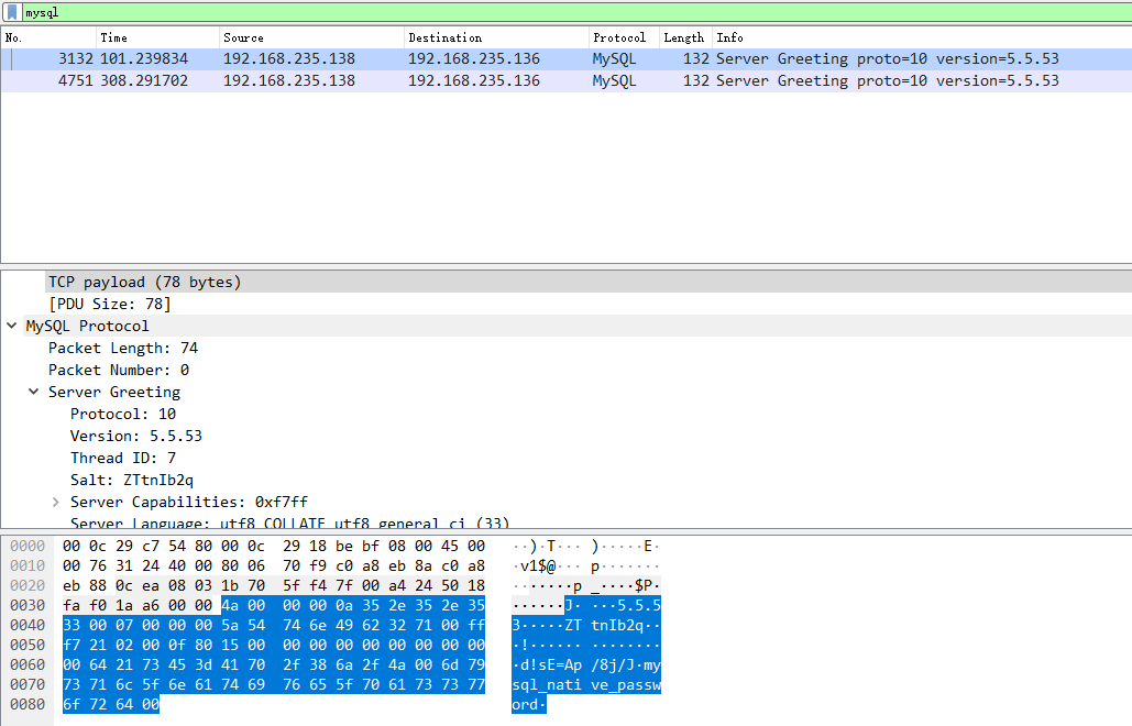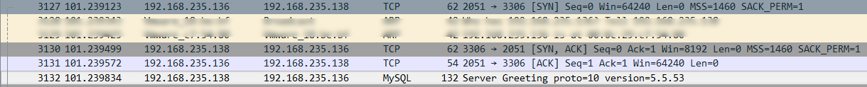 在 SYN 扫描时,它就发现了 3306 号端口(3306 号端口给它发送了 SYN + ACK),再一连接,Server 就会回复 Server Greeting,从而发现了 3306 号端口的存在,版本号也随 Server Greeting 的发出而同时泄露。