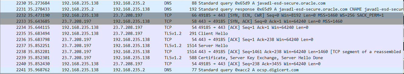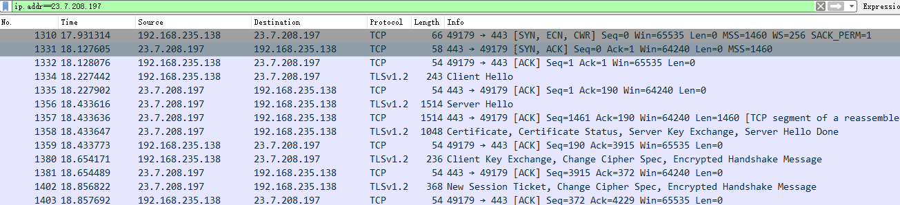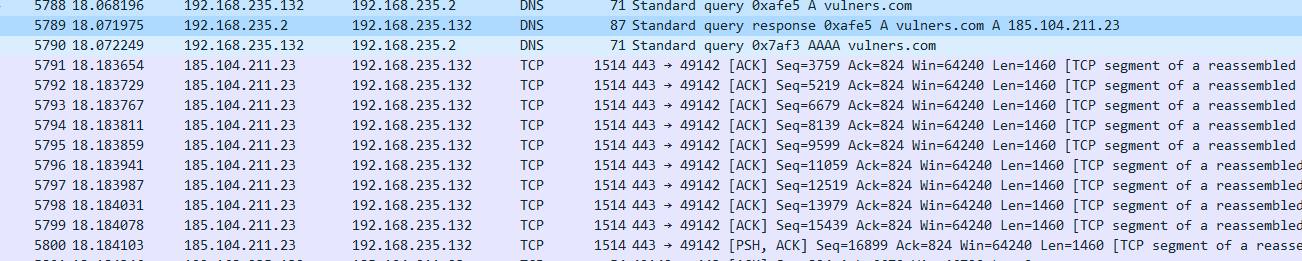 - 扫描期间,还可以看到目标机的 TLS 通信过程。含义推测是要进行 443 号端口相关的验证,需要用到这些协议。
