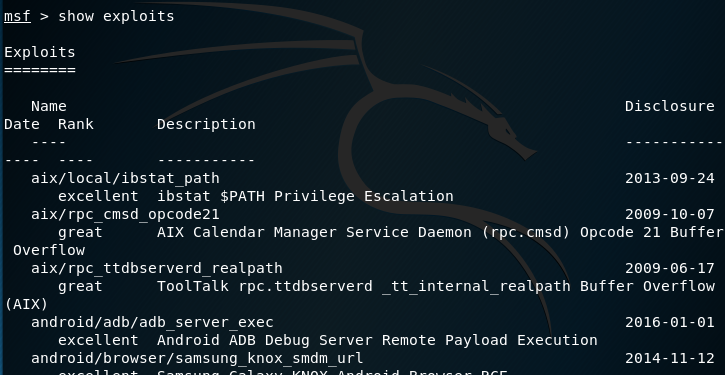 - 按照字母顺序,列表从左到右分别是漏洞名称、披露日期、可利用性、描述,其中漏洞的命名格式是 "平台/类型/具体应用简称"。由于我的 Kali 版本并不是最新的,所以披露日期可能比较偏早(与此同时,msf 的最新版本已经是 5.0 了)。