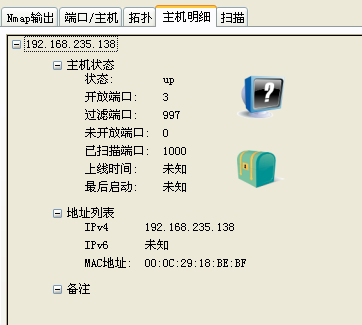 - 但是,扫描结果并不太准确,192.168.235.138 虽然是在线主机,但是可能是上一次扫描遗留下来的结果。我只扫描了 192.168.1.0 的地址段。