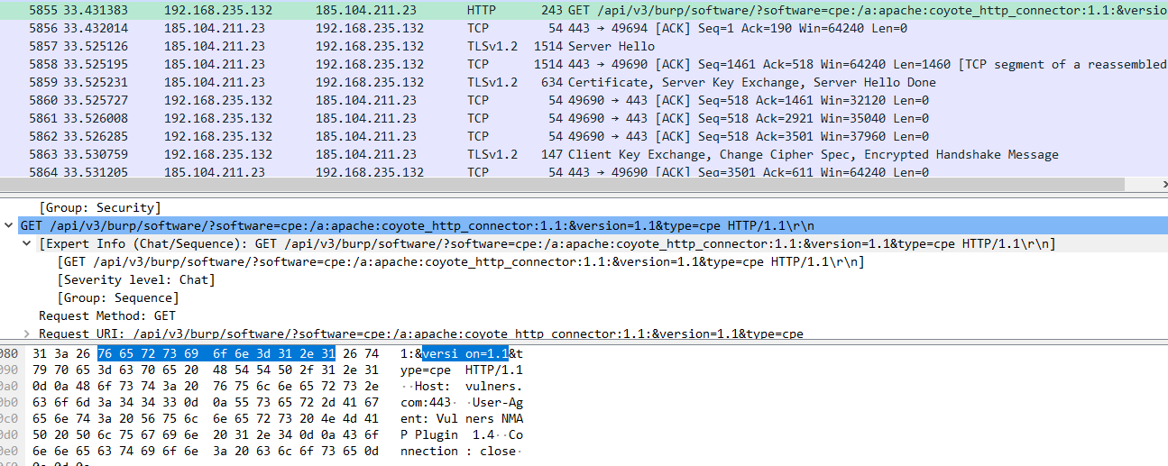 中间服务探测的过程与 intense 扫描基本一致,后期 vulners 检测工具与它自己的服务器进行了交互,可能是为了将特征与自己的数据库比对。